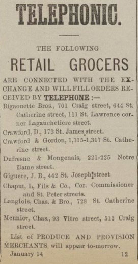 Ces entrées au journal constituent les deux premiers contrats de publicité signés avec des journaux. Intitulées « Telephonic », ces annonces publiées quotidiennement montrent des abonnés au service de téléphone provenant de commerces spécifiques (marchands de céréales, de produits, de provisions, etc.).