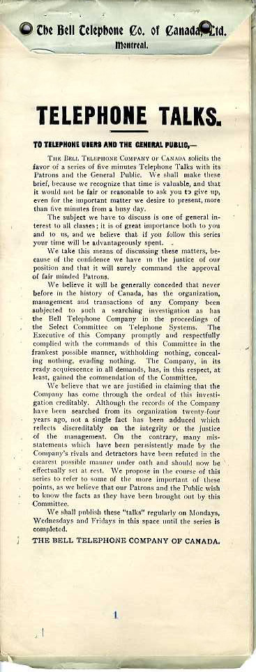 Au tournant du siècle, la population a le fort sentiment que les services publics doivent être détenus et exploités par l'État. C’est pourquoi Bell doit se soumettre à une enquête de la Commission des chemins de fer du Canada, l’instance dirigeante qui la réglemente à l'époque. Bien que l’enquête n’ait pas mené à la nationalisation de l’entreprise, elle a mis en lumière le besoin d’une meilleure communication entre Bell et le public concernant les changements de coûts et la mise à jour des services. C’est ce qui a mené à la série d’articles « Telephone Talks », publiés dans les journaux quotidiens et hebdomadaires, et destinés à la population générale.
