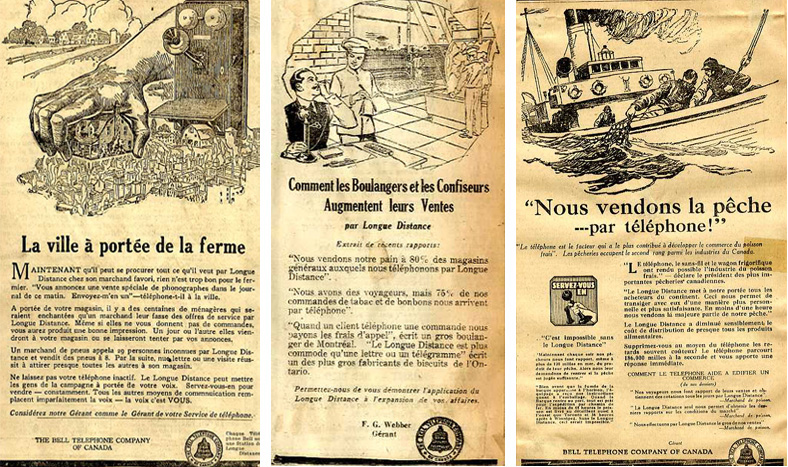 Durant les années folles, la popularité croissante du service longue distance donne lieu à plusieurs initiatives publicitaires. Le responsable de la publicité chez Bell de l’époque, C.E. Fortier, écrit : « La compagnie prévoit prendre tous les moyens possibles pour présenter le téléphone comme un outil au service du public et le service longue distance n’a pas encore été exploité. » Des campagnes de publicité majeures sont donc lancées pour faire connaître ce service. Bien que la première campagne de publicité s’adresse au grand public, la compagnie adopte ensuite une approche spécifique destinée aux gens d’affaires de divers secteurs d’activités.