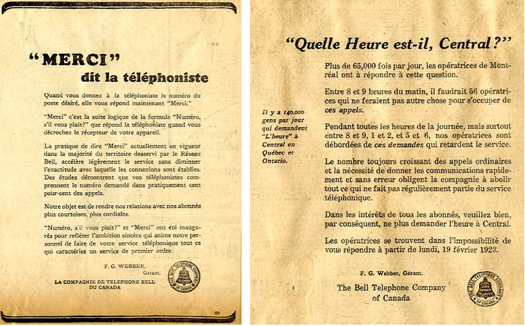 Au tournant des années 1920, les téléphonistes du Québec et de l’Ontario reçoivent chaque jour environ 140 000 appels d’abonnés qui demandent l’heure exacte au moment de leur appel! En février 1923, des publicités sont mises de l’avant afin d’informer les abonnés que cette pratique doit cesser puisqu’elle constitue une surcharge de travail pour les téléphonistes et nuit ainsi à la qualité du service offert aux autres clients. Quelques années plus tard, afin d’accélérer le service téléphonique local, Bell décide également que les téléphonistes ne répéteront plus le numéro demandé par l’abonné; elles répondront plutôt par un simple « Merci ».
