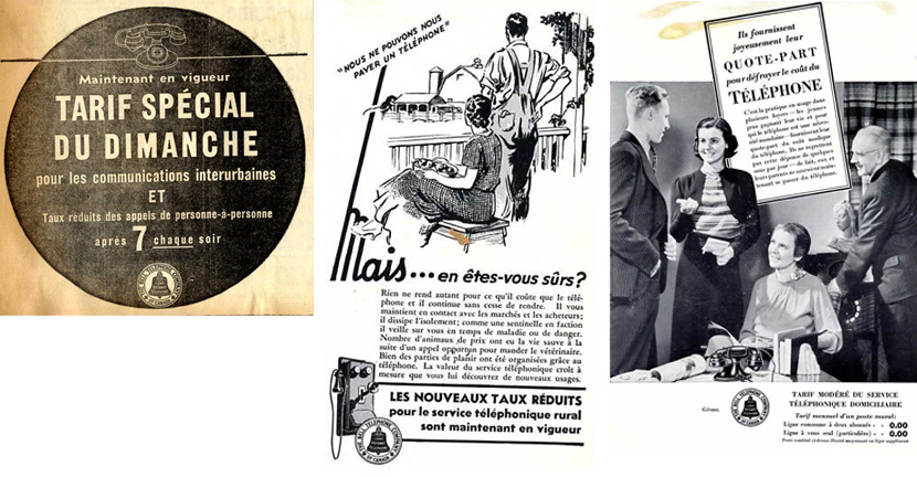Durant la Grande Dépression, Bell réduit également certains de ses tarifs afin d’aider les Canadiens qui éprouvent des difficultés financières. Les rabais offerts pour les appels longue distance, qui étaient généralement appliqués le soir, sont désormais disponibles toute la journée du dimanche. Dans les journaux des petites communautés rurales, on encourage les fermiers à s’abonner au service téléphonique en faisant la promotion des tarifs réduits et de la commodité du téléphone. D’autres publicités incitent les membres de la famille occupant un emploi de faire leur part en payant une partie de la facture de téléphone. Ce dernier, d’un point de vue social, devient vite une nécessité pour les jeunes personnes.