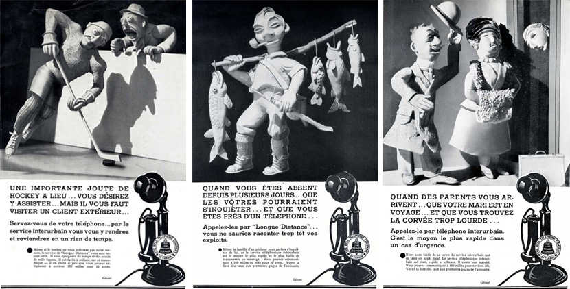 Durant les années 1930, la radio et les magazines rivalisent avec les journaux pour attirer l’attention du public. Le directeur de la publicité de Bell de l’époque, C.E. Fortier, privilégie les publicités diffusées dans les journaux, affirmant que « ce sont les journaux que nous devons continuer d’utiliser comme véhicule principal pour raconter notre histoire au public. » En 1933, le département de publicités de Bell renouvelle complètement ses illustrations dans les journaux pour une campagne utilisant des modèles en pâte à modeler plutôt que des photos de personnes. Ces nouvelles publicités novatrices et attirantes pour l’œil suscitent alors beaucoup d’attention.