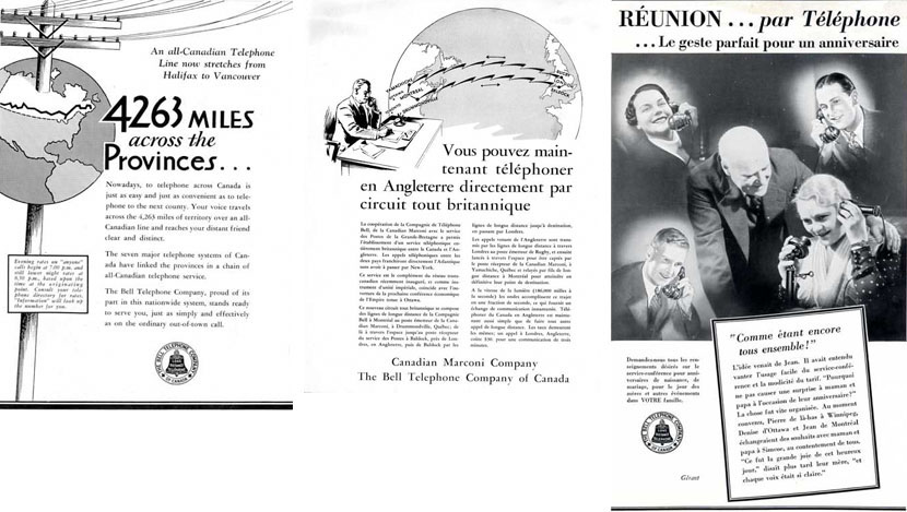 Le 25 janvier 1931, un effort coordonné de Bell et du Réseau téléphonique transcanadien permet aux clients d’effectuer un appel d’un bout à l’autre du pays grâce à une ligne téléphonique exclusivement canadienne, partant d’Halifax jusqu’à Vancouver. À l’été 1932, Bell, la Canadian Marconi Company et le British Post Office collaborent afin d’offrir un service téléphonique vers l’Angleterre au moyen d’un système d’ondes radio britannique, éliminant ainsi la nécessité d’utiliser l’équipement de la compagnie américaine AT&T. Lancé peu de temps après, le service de conférence téléphonique de Bell fait l’objet d’une importante médiatisation, alors que les publicités de la compagnie encouragent les familles à planifier des temps de rencontre afin de prendre des nouvelles régulièrement au moyen du téléphone.