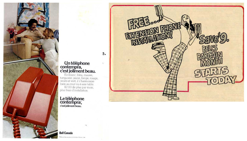 Le marché résidentiel évolue aussi, alors que Bell met en place plusieurs stratégies pour mousser les ventes de téléphones. C. W. Kirkpatrick, directeur général du marketing chez Bell en 1972, déclare : « la compagnie n’a jusqu’à maintenant pas pleinement exploité le plein potentiel que représente le marché des téléphones résidentiels supplémentaires ». Mis en marché à la fin des années 1960, le téléphone emblématique Contempra est le premier appareil entièrement dessiné et fabriqué au Canada et il fait l’objet de plusieurs campagnes publicitaires. Bell lance également la campagne « Un mois pour toi » en novembre 1972. Les publicités mettent en lumière le fait que, pour la première fois, les clients peuvent sauver 9 $ de frais d’installation s’ils achètent un nouveau téléphone.