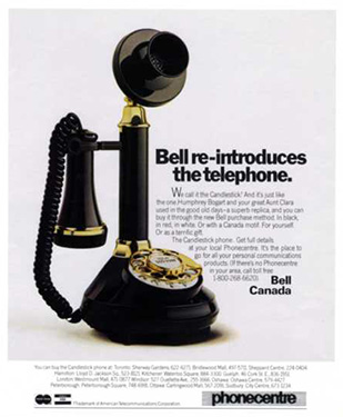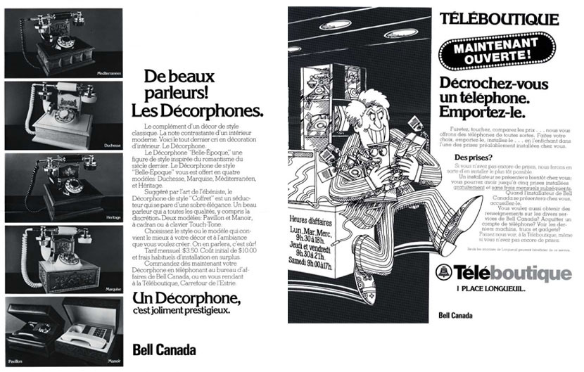 En 1974, Bell annonce un tout nouveau concept de vente au détail et lance les Téléboutiques. Ces dernières permettent aux abonnés de commander des téléphones, de retourner ou d’échanger de l’équipement, et de faire réparer leur appareil téléphonique sans avoir à prendre rendez-vous avec un technicien de Bell. Les publicités de cette période présentent une panoplie de téléphones aux couleurs et aux designs éclatants. Les clients des Téléboutiques sont encouragés à apporter un échantillon de tapisserie afin que des agents aux ventes formés les aident à choisir un téléphone qui s’agence à leur maison! Un catalogue de produits est également publié pour la première fois dans l’annuaire téléphonique, ce qui élargit encore davantage la portée de l’offre de produits de Bell.