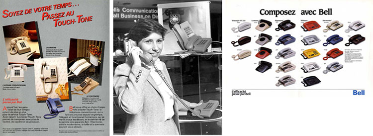 Les publicités de l’époque visent aussi à convaincre les clients à faire la transition du téléphone à cadran au téléphone à clavier, comme le téléphone Harmonie, appareil exclusif à Bell. Il s’agit d’un téléphone électronique léger et compact, doté de services téléphoniques spécifiques et disponible dans une variété de couleurs. Conçu par l’équipe Publicité de Bell, le présentoir pour magasin de détail dans la photo ci-dessous fait la tournée de nombreux centres commerciaux afin d’encourager les utilisateurs de téléphones à cadran à opter pour nos téléphones à clavier et nos services téléphoniques spécifiques.