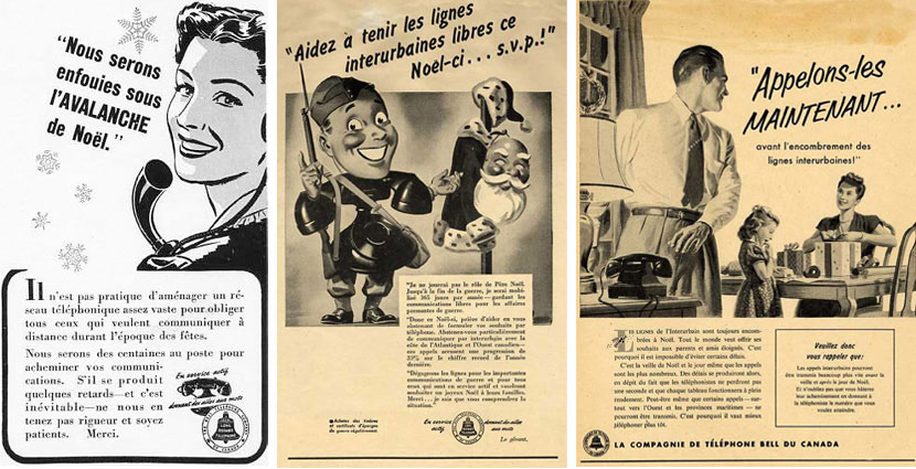 Bell ne manque pas une occasion de rappeler l’importance du protocole téléphonique à ses clients afin d’assurer le bon déroulement de leurs appels durant les Fêtes. Comme le soulignent les publicités ci-dessous, on suggère de passer un appel avant ou après les heures de pointe pour les appels interurbains et de donner le numéro de téléphone exact à la téléphoniste. Les publicités en temps de guerre encouragent les Canadiens à maintenir leurs lignes téléphoniques libres pour les urgences et pour que les militaires en service actif puissent communiquer avec leurs familles pour leur souhaiter de joyeuses Fêtes.