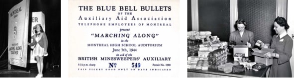 Les membres de l’Auxiliary Aid Association of Telephone Employees préparent des colis de Noël pour les employés en service outremer. Le groupe Blue Bell Bullets, connu pour offrir l’un des meilleurs spectacles présentés par des civils au Canada, fait partie des cinq groupes sélectionnés pour divertir le personnel militaire en Grande-Bretagne et en Europe.