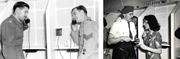 Pendant l’été de 1945, de plus en plus des trains transportant des troupes en direction de l’ouest du pays transitent par Montréal. Les services téléphoniques pour les vétérans de retour au Canada deviennent la priorité. Faisant preuve d’une grande ingéniosité, les techniciens de Bell aménagent des circuits téléphoniques et font passer des câbles par-dessus des clôtures et sous des voies ferrées pour installer des bornes d’interurbain. Les soldats peuvent ainsi communiquer avec leur famille et leurs amis avant de remonter à bord d’un train. Les représentants des services de Bell sont sur place pour les aider et les mettre rapidement en contact avec une téléphoniste.