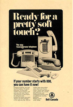 The 1970s marked a turning point in Bell’s products and service offerings as the company embraced new innovations including computers and digital technology. Introduced by Bell in the mid-1960s, the keypad paved the way for telephone-computer communications to support businesses and commercial transactions. Advertising from the early part of the decade encouraged subscribers to switch from rotary dial phones to those with keypads to enable more accurate and faster dialling, and to pave the way for innovative services in the digital era.