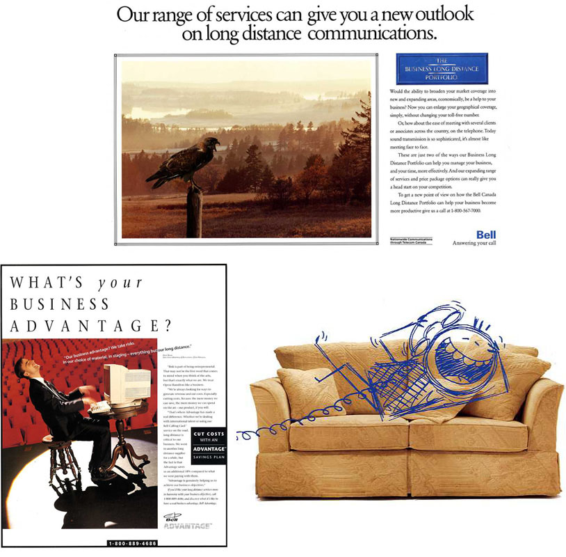 Facing  increased competition in the long distance market, Bell’s advertising department  created campaigns that highlighted the many advantages of choosing Bell. In 1993, Bell launched the “Bell Advantage”, a new brand exclusive to business clients offering long distance plans that delivered exceptional value. Around the same time on the residential side, Bell launched the RealPlus plan, illustrated by this playful print ad featuring the hand-drawn character ‘Max’.