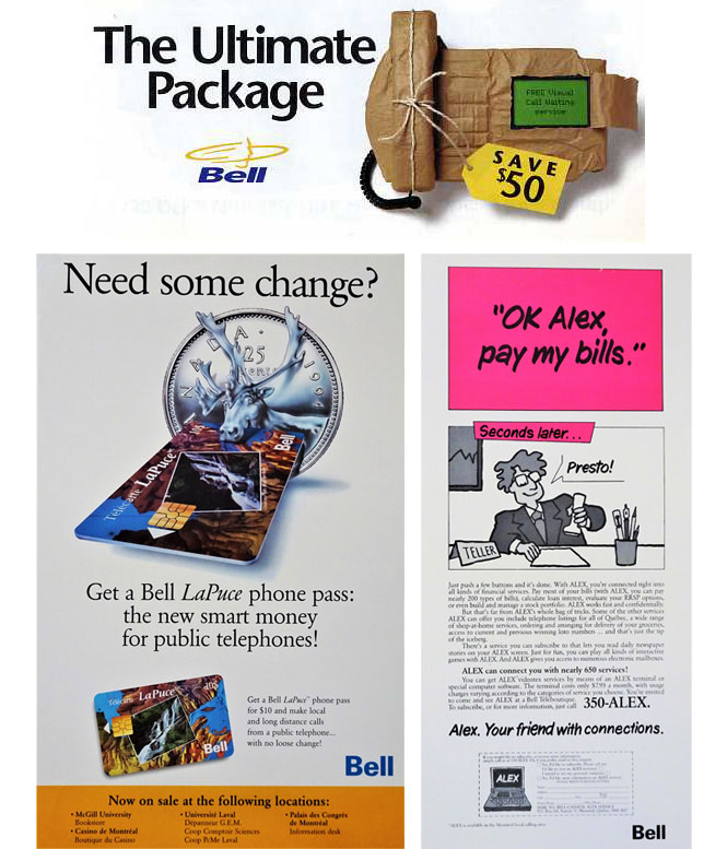 Bell ads from the 1990s also showcased new innovations such as ALEX, a videotext service offering a wide range of information and transactional tools. A few years later, Operac services were introduced, enabling customers to access financial services, weather and online purchases from the next-generation Vista 350 telephone set. Bell also introduced the LaPuce phone pass, a Canadian first, which enabled customers to make a call from a public phone without the need for coins.