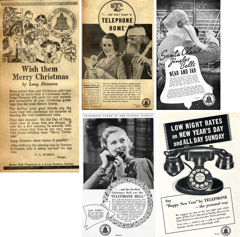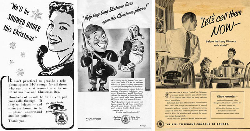 As the ads below highlight, Bell didn’t miss an opportunity to remind customers about important telephone etiquette to keep things running smoothly during the holidays, including making your call before or after the long distance rush hours and giving the correct telephone number to the operator. Ads during war time encouraged Canadians to keep the telephone lines clear for urgent matters, and so that those on active service could get through to wish their families a happy holiday.
