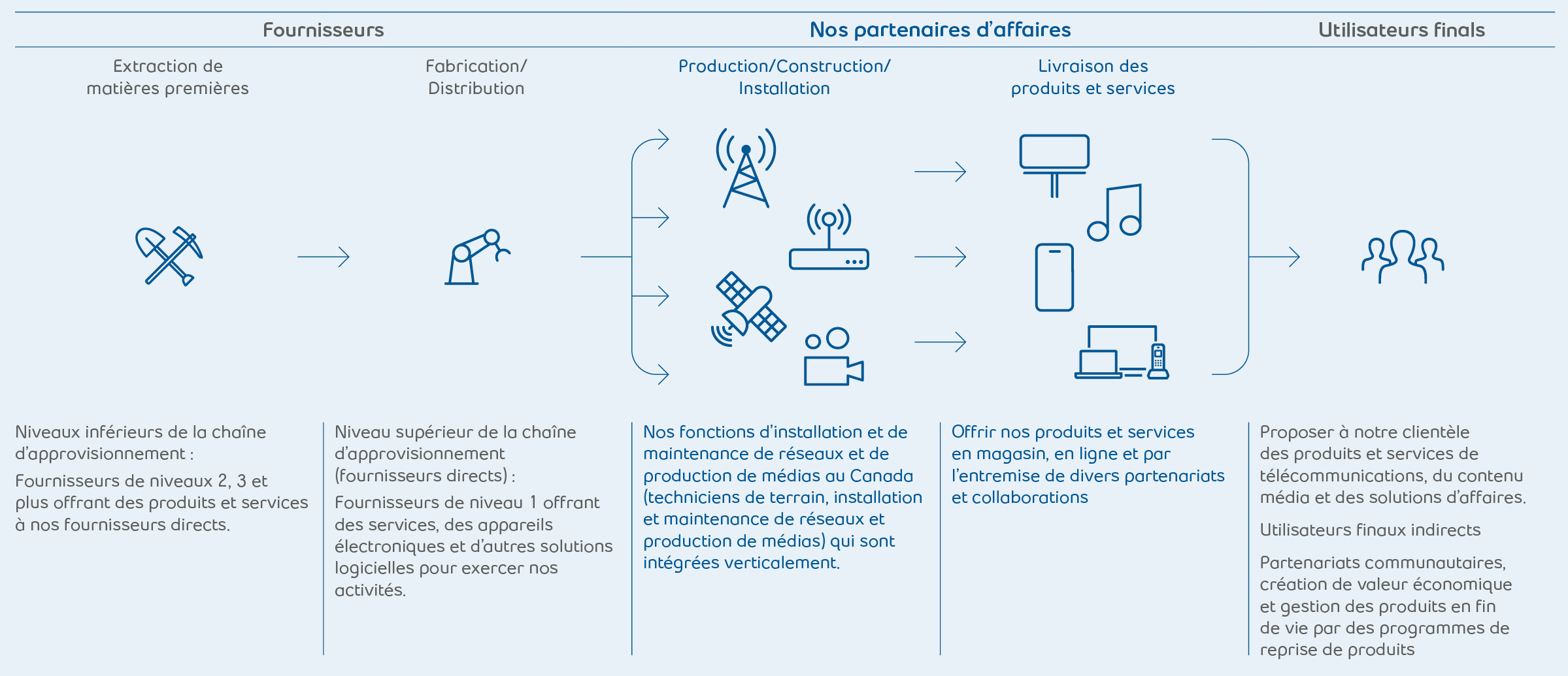 Il devient de plus en plus important d’avoir une vue claire de l’ensemble de la chaîne de valeur d’une entreprise pour établir de saines pratiques d’exploitation. Chez Bell, nous cherchons à élargir continuellement et à approfondir simultanément notre connaissance des acteurs et des enjeux propres à notre chaîne de valeur. Bien que nos activités et notre sphère d’influence soient principalement exercées au Canada, nous participons à des groupes de travail internationaux avec des entreprises provenant de notre industrie ainsi que d’autres secteurs.
